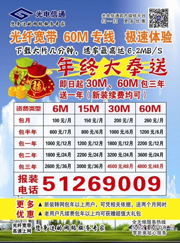 即日起新装或续费30M、60M包三年即送一年,最低合每月93元,超低价格享受更高带宽,详情拨打光电信通宽带客服电话:010-51269009