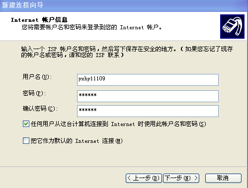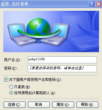 7、输入由光纤宽带提供的用户名和密码(图示)