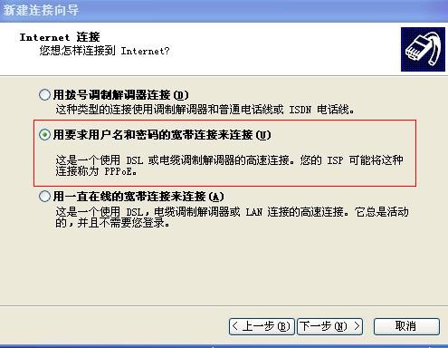 5、用要求用户名和密码的宽带连接来连接(图示)下一步: